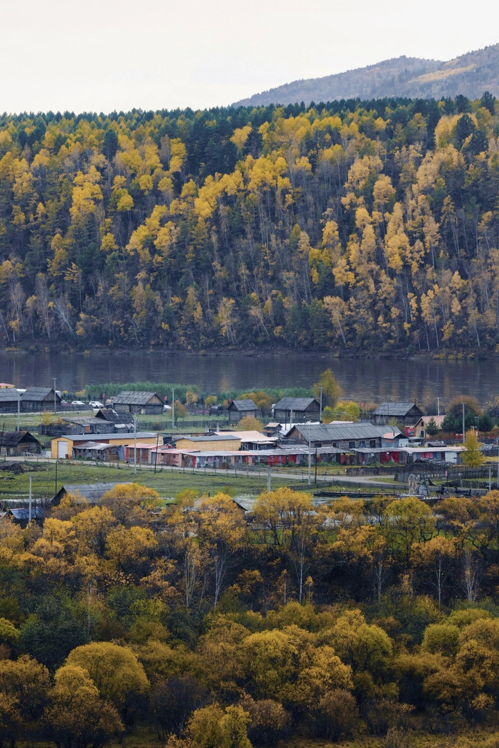 小村被秋色浸染,河水与木屋低语,是对满山金黄的告白。