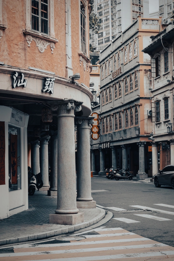 阴天的汕头小公园自带滤镜,老骑楼的立柱爬着岁月的痕迹,转角的“百货大楼”还是民国时的气派模样,连路牌都是“汕头瑞成源”“南洋北货”的复古字样,随便站在骑楼廊下,都像闯进了旧电影里的街景。