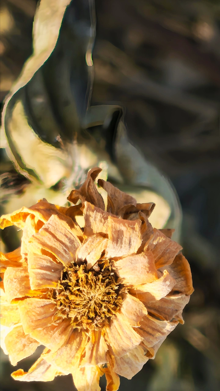 残花落瓣的百日菊已繁华退尽,初冬时节完美的留下了残红点点,竟比盛开时更有一番风致、静谧与美感。诠释了残花之美也是一种别样的美,留下了比盛开更深的印记!