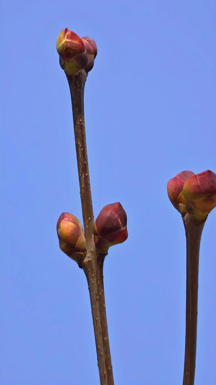 在植物园里,偶遇了一颗贴梗海棠。让我惊讶到:“刚刚入初冬,春天的气息已扑面而来”!紫褐色带刺的枝条上面,猩红色的花苞丰润如胭脂,在蓝天的衬托下染就的更显热烈、娴静、妩媚!贴梗海棠它喜光耐寒,果实芳香可入药。文化寓意凸显,象征着热情、领导力与坚韧不拔!