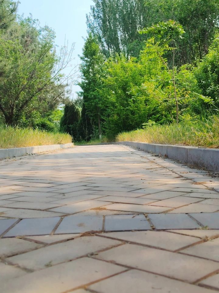 一条砖石铺就的小径,延伸向葱郁的绿意深处。阳光洒落,给路面披上一层柔和光晕。两侧草木繁茂,或绿或黄的叶片交织,透着蓬勃生机。四周静谧,仿若能隔绝尘世喧嚣,只余自然的清新与安宁,宛如一处能让人身心舒缓、暂忘烦忧的世外桃源。