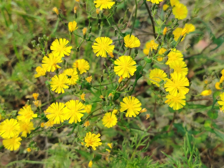 画面中,一片灿烂的苦荬菜花朵尽情盛放。明黄色的花瓣如丝缕般舒展,簇拥出饱满的花盘,在阳光下熠熠生辉。细长的茎干错落伸展,或含苞待放,或欣然盛开,生机满溢。背景绿意朦胧,似是广袤原野,衬托得这一簇簇黄花愈发明艳动人,尽显自然蓬勃之美 ,仿佛奏响一曲清新的田园乐章。