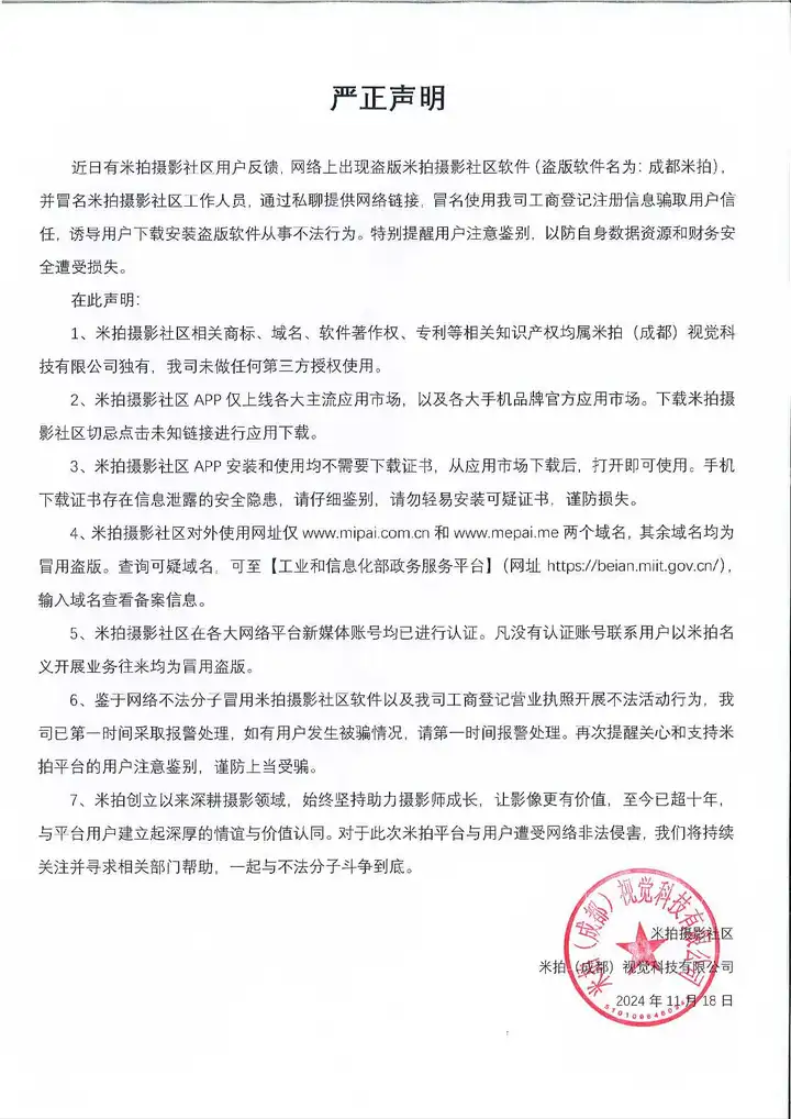 近日有米拍摄影社区用户反馈,网络上出现盗版米拍摄影社区软件(盗版软件名为:成都米拍),并冒名米拍摄影社区工作人员,通过私聊提供网络链接,冒名使用我司工商登记注册信息骗取用户信任,诱导用户下载安装盗版软件从事不法行为。特别提醒用户注意鉴别,以防自身数据资源和财务安全遭受损失。
