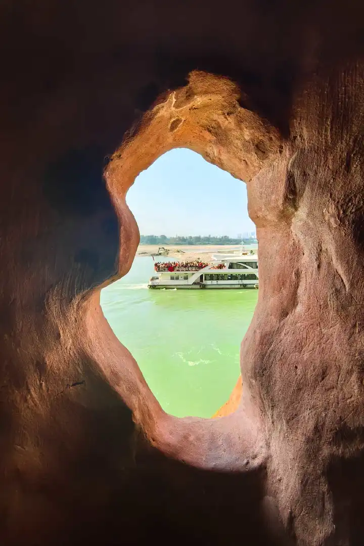 构图方面,照片通过窗孔的框架形式创造了良好的前景,这种构图方式有效地引导观者的视线集中于船只和水面之间。然而,船只在画面中偏下的位置或许会使得某些观者对画面平衡产生疑虑,建议将船只稍微提升至中心位置,以增强调和感。后期处理方面整体表现良好,色调与对比度的调整适度,未显现明显的过度修饰问题,但可以考虑增加图像的饱和度,让色彩更加生动活泼。
