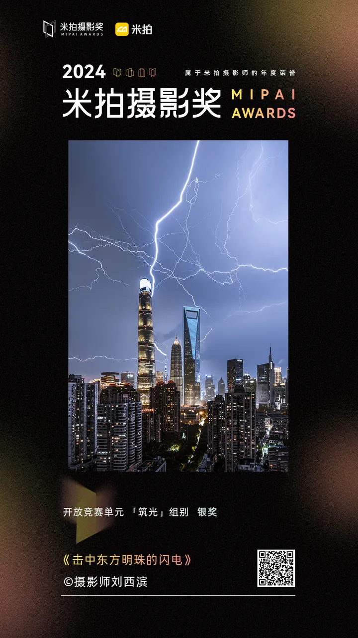 ⚡️🌆 蓄谋已久拍到的上海闪电,获得了2024年度米拍摄影奖·开放竞赛单元「筑光」组别银奖。2024年7月10日傍晚,在@主任和@雷云两位大佬的提示后,立刻去了陆家嘴某高楼等待闪电,在雨后能见度逐渐变好时,有幸抓拍到了获奖图片中的景象。回到家后第一时间进行了后期修图,并发布在了米拍中,获得了米拍推荐和767.76的评分✨