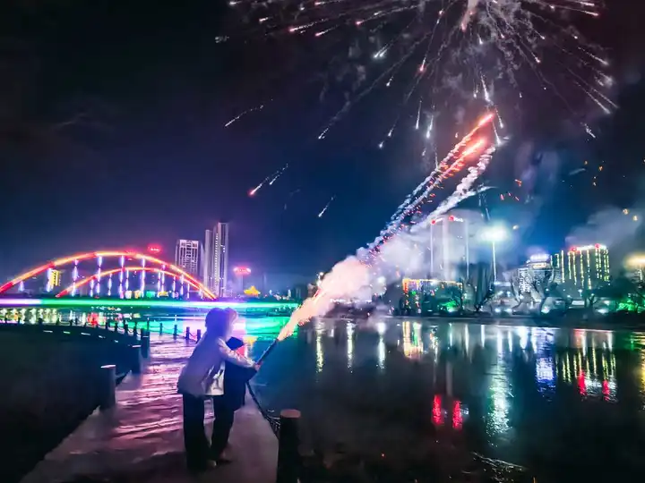 这张照片记录了放烟花的场景,画面热闹,但仍有提升空间。**色彩**方面,画面色彩丰富,烟花的焰火、城市霓虹灯以及水面倒影交织在一起,具有一定的视觉冲击力,但整体色调略显杂乱,缺乏统一的色彩基调,可以考虑在后期调整中降低高光,略微降低饱和度,增强画面色彩的和谐感。**光影**上,主体的光线主要来源于烟火和城市灯光,虽然烟火照亮了人物,但由于是夜晚,主体略显黯淡,且光线不够柔和,可以尝试使用补光设备,例如手电筒或闪光灯进行补光,以突出主体细节。**构图**上,整体构图较为随意,人物主体虽然处于画面下方三分之一处,但不够突出,画面元素较多,容易分散视线,建议使用更具引导性的构图方式,比如利用水面倒影的延伸感引导观众视线,或者使用框架式构图,以突出烟花和人物主体。**后期处理**方面,感觉后期处理痕迹不明显,饱和度偏高,可以适当降低,调整对比度,使画面更加通透,细节更加丰富,但要注意避免过度修饰,保持画面的自然感。**主题原创性**上,拍摄烟花场景较为常见,缺乏一些新颖的视角和创意,可以考虑在构图和拍摄角度上寻找突破,比如尝试低角度仰拍,或者在烟花绽放瞬间捕捉人物的动态。**情感共鸣**上,虽
