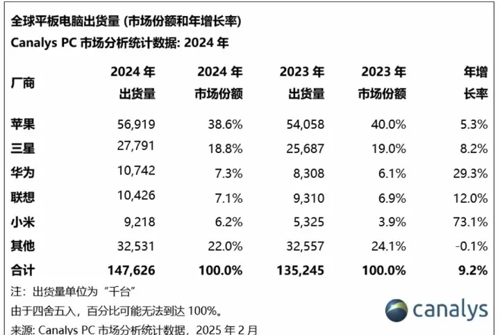 ❸华为 约1074.2万台,7.3%,同比+29.3%