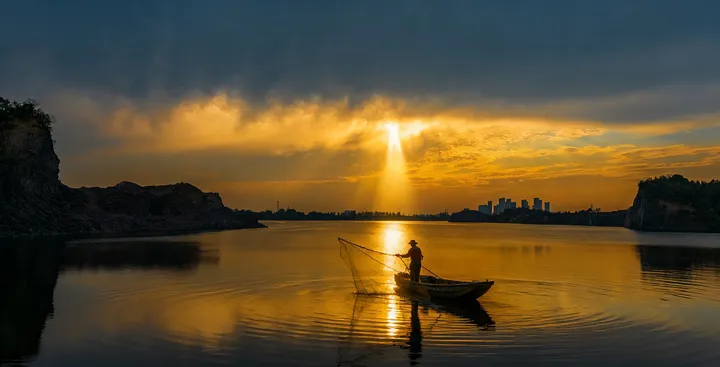 夕阳西下,渔夫撒网。生活不就是这样吗?有起就有落。