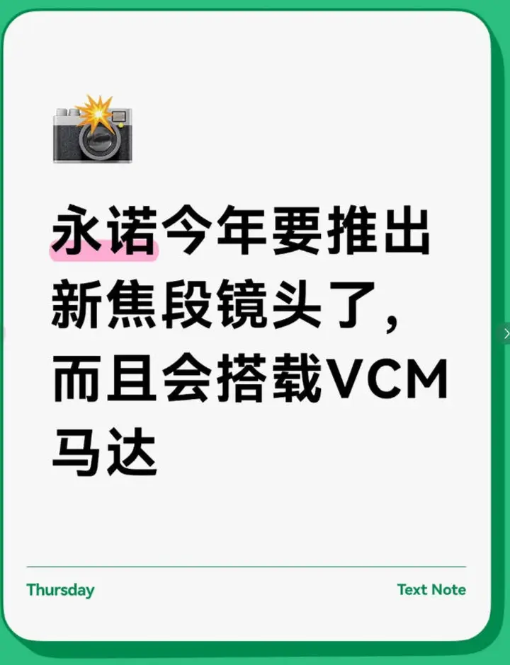 近日,疑似永诺工作人员在其社交媒体透露,该品牌将于今年推出搭载VCM马达的镜头,具体规格尚未公开。目前坊间已有样品外观图片流出,虽焦段信息被隐藏,但其体积与永诺YN 50mm F1.8S DF DSM相近,且滤镜口径同样为58mm。猜测以后国产镜头将陆续普及VCM马达技术。你认为这会是一款什么焦段的镜头?欢迎在评论区分享你的看法!