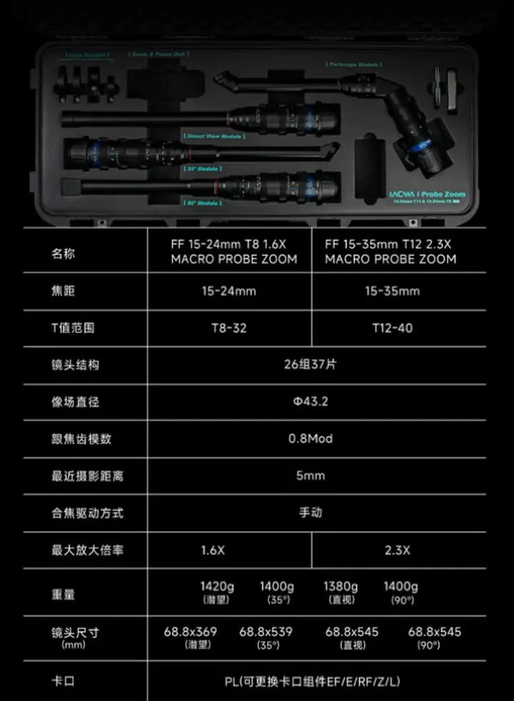 老蛙正式推出两款变焦探针镜头:FF 15-24mm T8 1.6X MACRO PROBE ZOOM与FF 15-35mm T12 2.3X MACRO PROBE ZOOM。