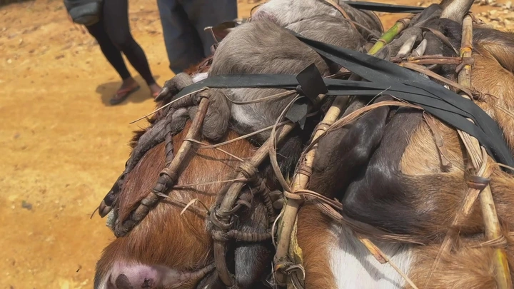 在利比里亚,人们把从热带雨林里狩猎获得的动物肉类统称为“丛林肉”,是除了鱼类以外主要的肉食来源。“丛林肉”主要是几种鹿、穿山甲、猴子、豚鼠、鳄鱼、旱龟和丛林野牛。原来人们也会猎杀黑猩猩,现在猎杀黑猩猩会被判刑。 林区现在出于“休眠”状态,去林区悼念在国内期间去世的族长老太太和她的长孙。老太太去世时93岁,长孙四十多岁,死于肾衰竭。在米拍里发过不少族长老太太的照片,之前每次去林区,离着很远,老太太就会跳着舞过来拥抱我。在去林区的路上,似乎总是想着进到村里时,老太太会跳着舞过来拥抱我。然后突然想起,她已经不在人世。 接近村子,猎人乔治骑摩托托着很多的猎物去州府贩卖。通行的黑人想买几只鹿。买了一只麂子和一只斑马鹿,因为这种鹿身上长着黑色的条纹,所以当地人叫这种鹿为“斑马鹿”。这种鹿已经属于濒危动物,禁止狩猎。问乔治要多少钱,他说随便给,给了他20美元。以往在林区,都是买一盒20美元20颗的子弹,换两只鹿。拍视频,乔治胆胆怯怯的说,千万别发脸书。我说不会的。 没有冰箱,丛林肉保鲜是把肉放在炭火上烤干。第一天中午买的鹿,第二天中午切成块的鹿肉已经烤干。