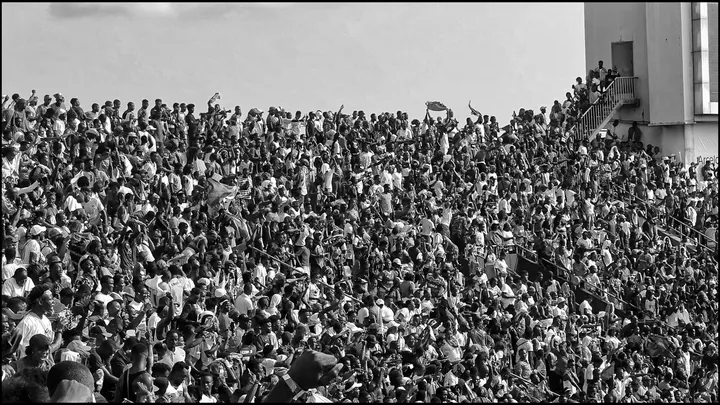 利比里亚足协杯决赛。上午从健身房出来,去看球。比赛说是两点开始,但是必须至少早到两个小时左右,否则不可能有坐。普通票5美元以上,屋檐下的20美元,用玻璃房隔开带空调的VIP坐席80美元。比赛三点半才开始。最后点球决胜。烈日当空,图7是我后面几排晕倒的,被热心好观众抱了下去,应该是第一个晕倒的,还从铁栅栏开了小门放担架上运走。后来中暑晕倒的前仆后继,有时同时有三、四个,但是不再开铁栅栏门,因为总会有狂热观众借机会往场地里跑。图12,可不是黑人想翻栅栏过去拥抱球员,是人们一起把一个晕倒的女孩从估计有四米高的铁栅栏抬过去。图8、9,翻栅栏的女孩之前晕倒了一会,当人们把她往铁栅栏上抬时醒过来了,开始自己翻越铁栅栏,跑道上的球门里躺着的是一个晕倒的男观众,正等着抬担架的过来。图11、12,消防车是用来往观众席喷水降温的,就一辆消防车,喷不了多少看台也就没水了,我坐的看台始终是被消防车遗忘的角落。现场高音喇叭一直喊话,希望消防队能多排几辆消防车来。没用。图13,被抬走的球员不是因为受伤,是中暑,前后两个球员。图15,上下半程各设立了5分钟的“降温休息”时间。直到比进入加时比赛,太阳逐渐落下去。