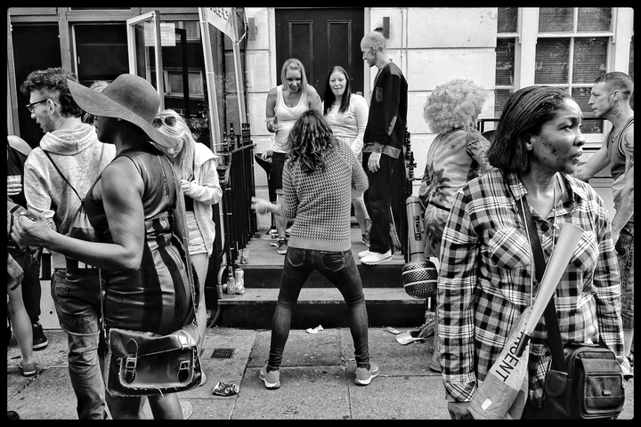 诺丁山Potabello Road上的人们。 觉得AI测评很有意思,“ 这张照片在抓拍和情感表达上具有很高的水准。首先,黑白色调增添了照片的经典感,简化了画面元素,使观者更容易专注于主体本身。光影处理得当,彰显了图像的层次感,从高亮的天空到阴影部分的过渡自然。构图上采用了垂直线条和几何对称,使画面非常稳定,同时对话(跳跃)的两组人形成了对比和平衡,不仅增加了画面的趣味性,还赋予了照片叙事结构。人物的姿态和表情自然,突出了现场的氛围和情感互动,能够引发观者的共鸣和思考,例如人与人之间的关系和交流。背景的街景虽然细节丰富,但并不喧宾夺主,反而为人物提供了一个具象场景,增加了真实性和代入感。可以改进的地方是窗口部分稍显杂乱,一些不必要的背景元素可以在后期处理中稍微简化或调整。另外,两个画面中的焦点人物之间可以通过打光或后期处理进一步突出以增加视觉冲击力。”
