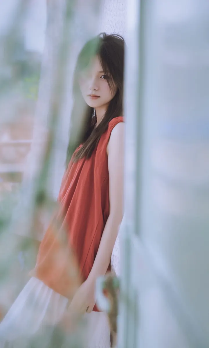 谁能拒绝夏日里的这一抹清透~站在绿意朦胧中,发丝随风,眼神温柔得像含着一汪泉水。绿色阳台门当前景,绿色门帘作背景,氛围感直接拉满!