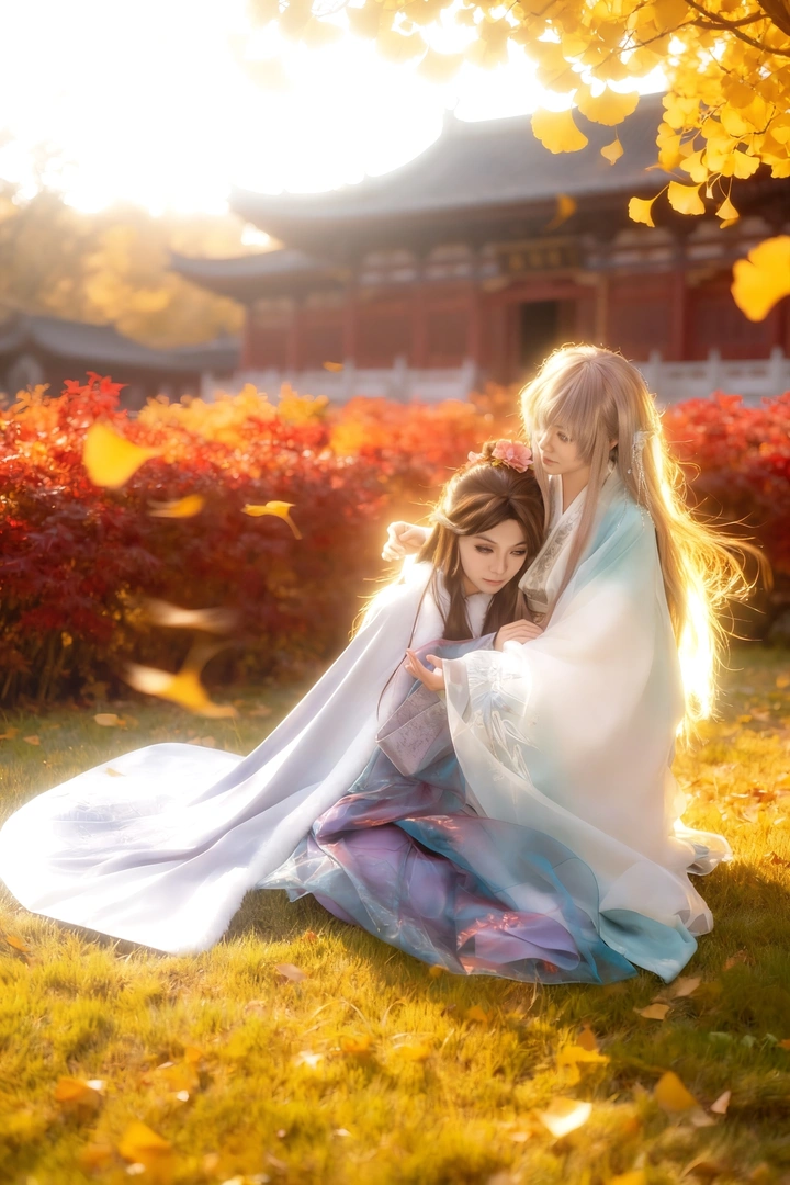 这是卡牌游戏《代号鸢》中角色袁基与广陵王的COS照片,2025年11月23日拍摄于德阳市石刻公园内。但是因为石刻公园的景色和角色的画风不搭,所以在完成原本照片修图后,使用AI对照片的背景进行了重构,但保留了人物整体不变,这样,就使得cos的角色符合其背景设定。