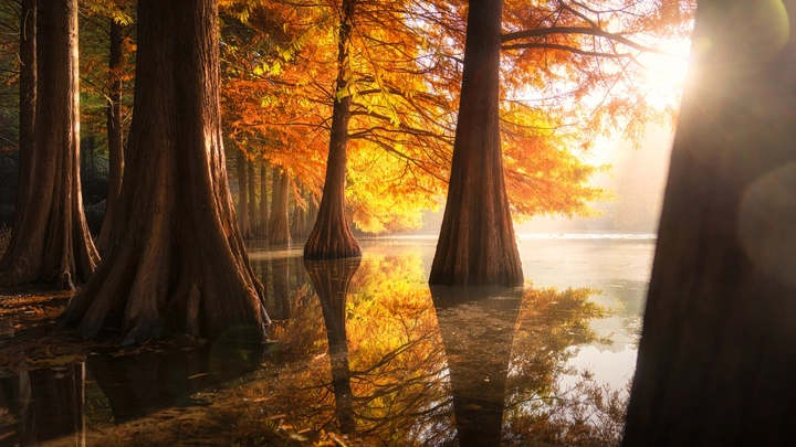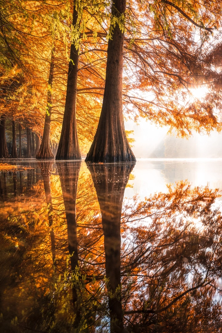 秋日的南京燕雀湖,落羽杉树叶渐红,能看到又黄转红的色彩变化。在日出前我就提前就位等待,只为了拍到日出时的这一刻。当清晨的第一缕阳光穿透树林,分割出丁达尔的光线,我把相机贴近水面,按下快门得到了这张照片。 清晨的水杉林与水面倒影相印成趣,更添一份秋色 Shot on Sony a7m4