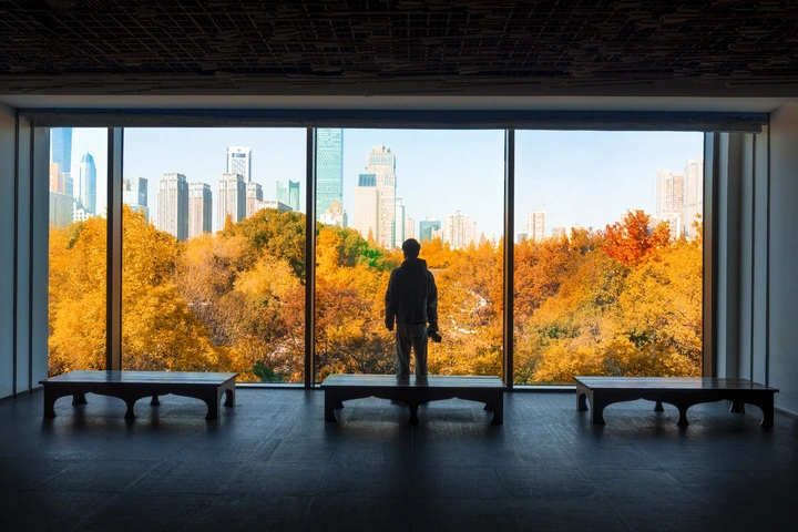 巨大落地窗中,是远处的南京城市与近处的秋日风光。拍摄于南京六朝博物馆,深秋时节的窗外,秋色正浓,我走到窗前欣赏这盛景。南京的秋,仿佛被装进了巨大的画框,自成一副展览画作 窗外是自然秋景与南京城市融合,自然与建筑的交响 Shot on Sony a7m4、Sigma2870mm