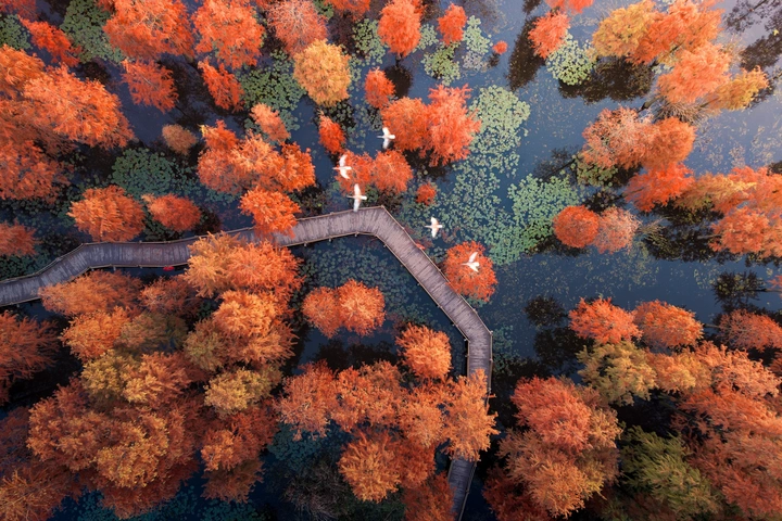 拍摄于南京池杉湖,进入深秋时节,所有落羽杉都已转红,升起无人机,我发现三条栈道刚好切分了池杉湖的秋色 池杉湖湿地公园地跨江苏省南京市六合区与安徽省滁州市来安县,总面积5800亩,由森林沼泽、河流湿地及库塘等构成,拥有华东地区最大的池杉林 Shot on Dji air3s