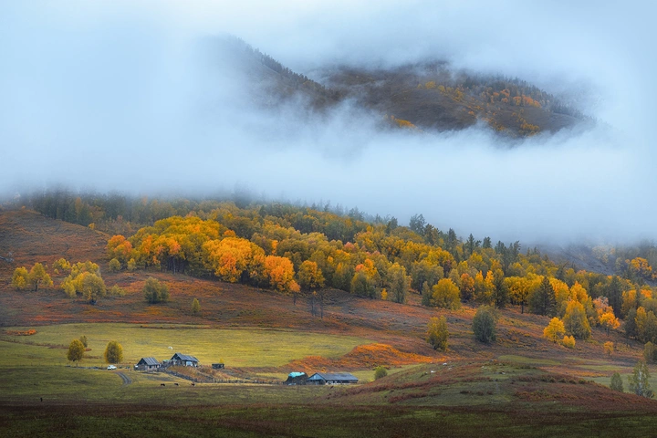 晨雾漫过山峦,秋林燃作金橙。坡下屋舍静卧,草场浸着暖光,这是北疆深秋里,被雾霭轻拥的烟火诗意。