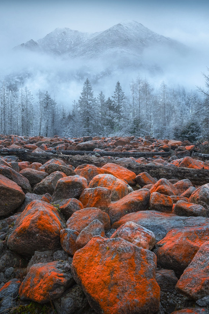 雾裹青山,霜覆寒林。橙红地衣裹满乱石,朽木横陈,冷调里烧出一捧热烈烟火。