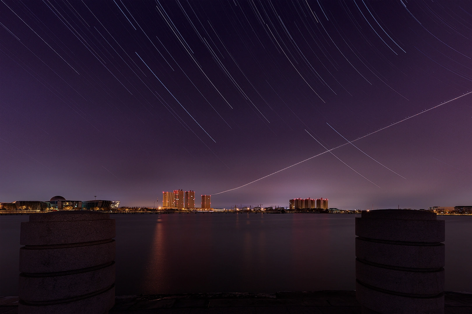 黑龙江省,大庆市,时代广场,万宝湖上空的蓝色幻想! 城市中的光污染虽然严重,但不代表就无法拍摄星轨[嘻嘻][嘻嘻][微笑] 单张曝光170s,F6.3, ISO50,26张堆栈[酷][酷]!