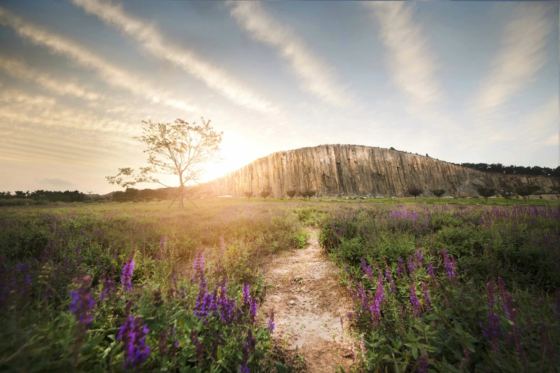 一个游客很少的地质公园里,第一次去就恰好遇到难得一见的条纹云和落日柔和的光线与花园。