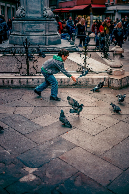 威尼斯广场上的少年。 男孩子童年的时光总是充满活力和好奇心。 对于飞舞的鸽子,我还是依稀能记起来在那个年级时心里按捺不住的冲动的。