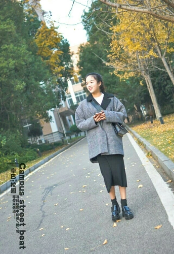 #辛巴校园街拍# 千鸟格的帅气西装+半身裙,脚踩小皮鞋,很有韩范,扎高的麻花辫和甜甜的笑很俏皮呦[em]e400835[/em] 坐标:湖南工程学院新校区