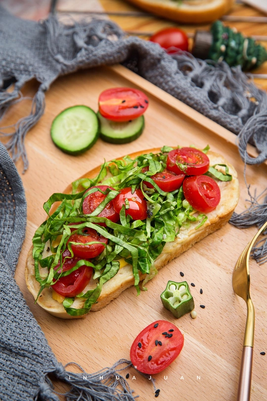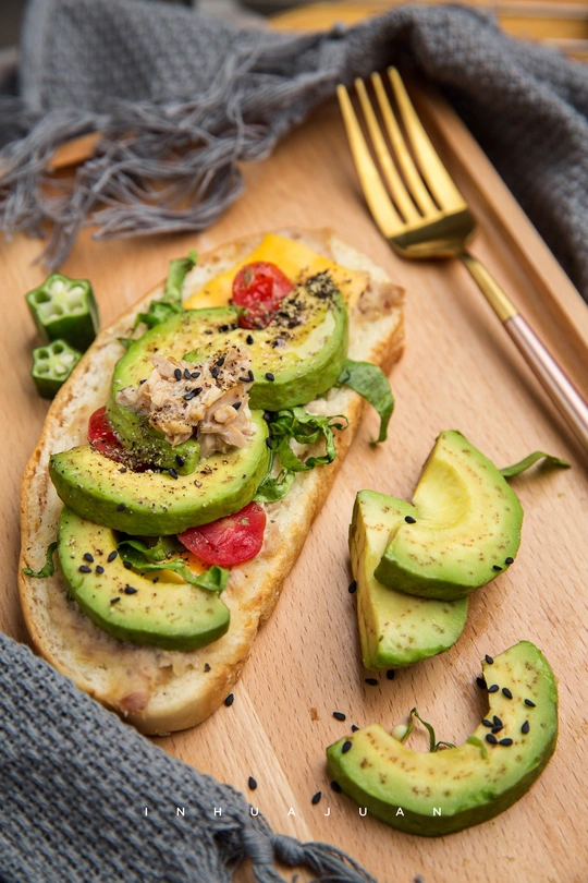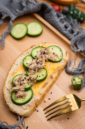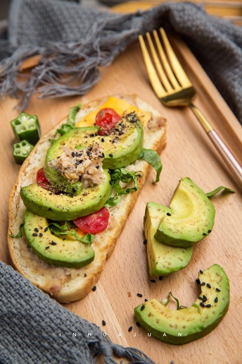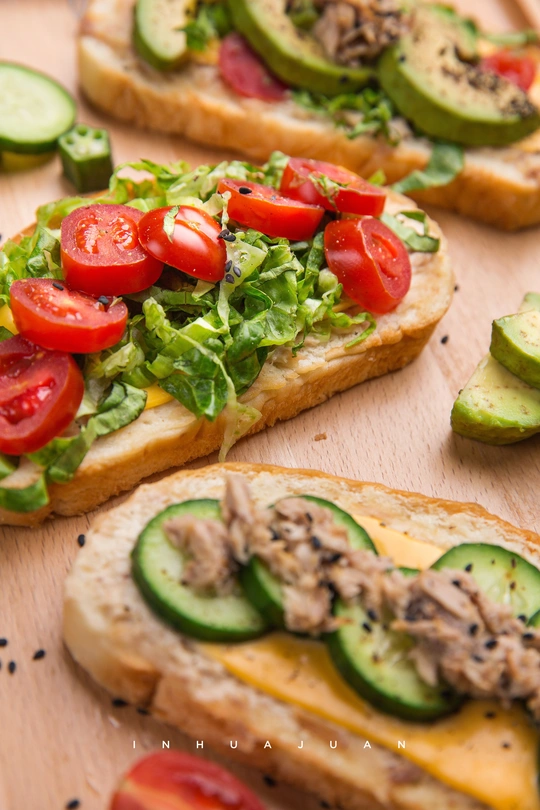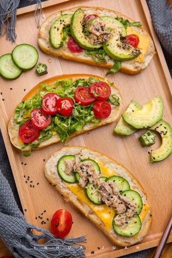 Day3. 开放式三明治 材料:牛油果,圣女果,小黄瓜,生菜,芝士片,金枪鱼罐头,香甜口味沙拉酱,面包 做法: 1.切好材料,预热175度烤箱5分钟 2.金枪鱼跟沙拉酱搅拌混在一起,涂抹在面包上,芝士也一起放上去,放入预热的烤箱烤五分钟拿出来 3.喜欢吃的食物放上去最后摆盘就可以开吃啦