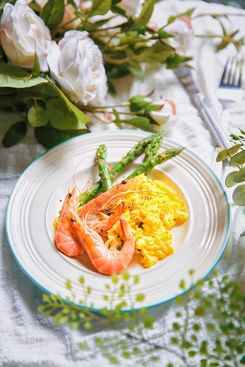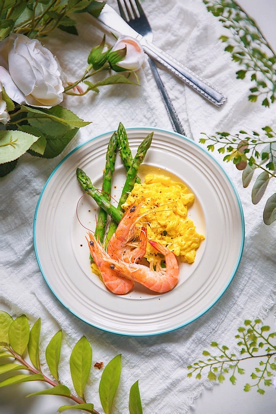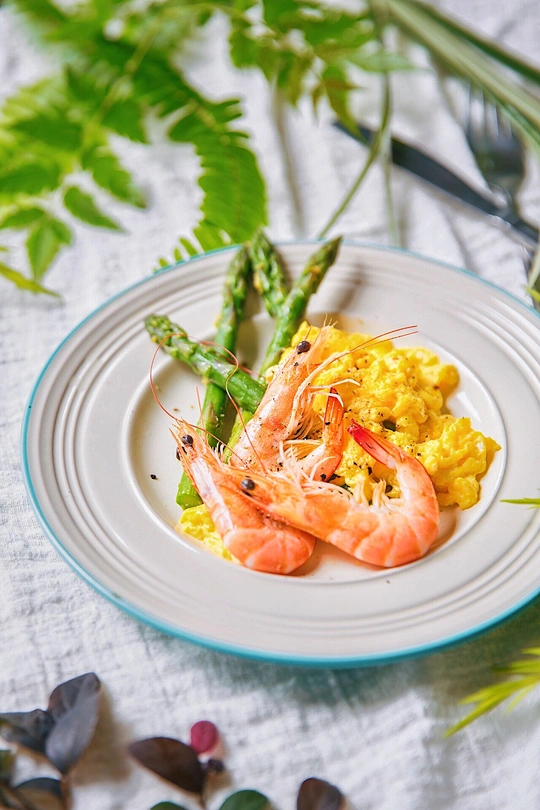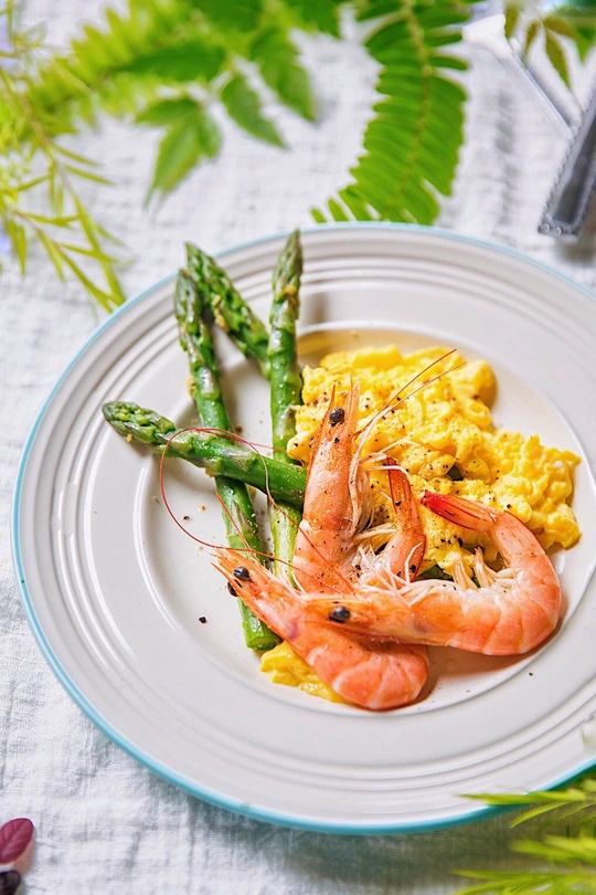 21天早餐挑战-Day5. 虾仁滑蛋芦笋 材料:河虾,鸡蛋,新鲜芦笋 做法: 1.河虾与芦笋开水煮熟 2.滑蛋做法:平底锅烧开后放油,关小火倒鸡蛋液,慢慢把鸡蛋液推开,记得一定要小火,这样鸡蛋才能吃起来嫩嫩的,最后摆盘撒上黑椒