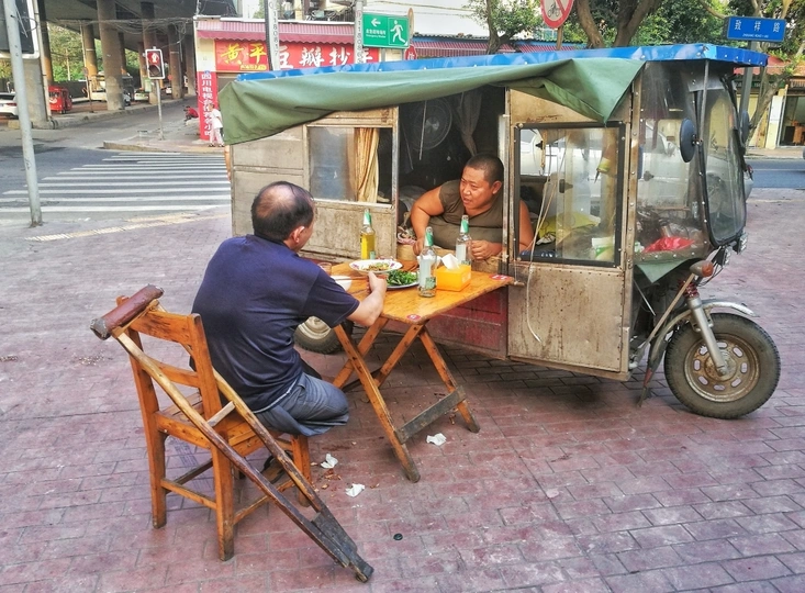 《两个残疾人的晚餐》2018年7月24日,使用华为手机,拍于四川省成都市青龙场致祥路口。