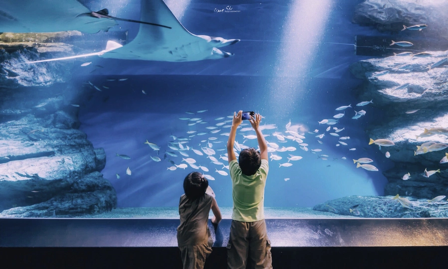人山人海的水族馆举行了花火海豚表演节目,趁人来人往之际捕捉到了这个有爱的瞬间,哥哥带着妹妹一起看Manta游过