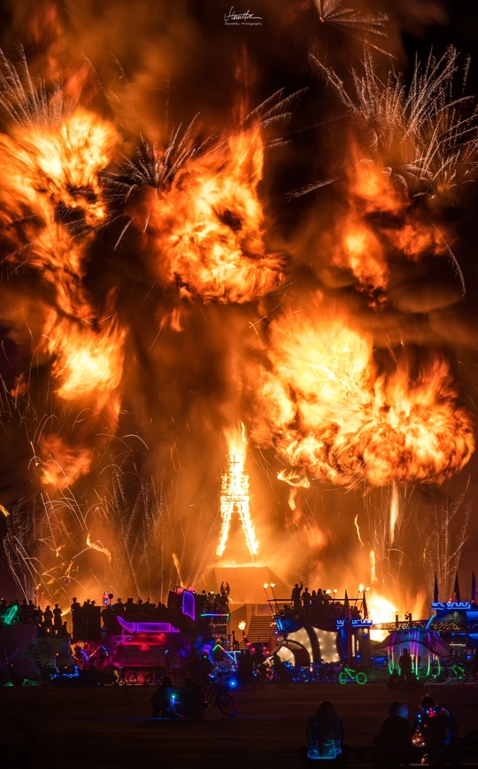 梦醒时分 一场蘑菇云后,火人节结束,梦醒了 火人节/黑石城 自世界各地的Burner每年同一时间在这个寸草不生的荒漠里凭空兴建起一个只有8天的寿命“城市“,城市内唯一提供的设施是厕所,唯一售卖的物品只有2样:冰和咖啡。其他任何生活用品均须自带。8天过后,“居民”离开,且 “leave no trace”, 所有垃圾自己打包带走,片甲不留,城市人间蒸发,又恢复成荒无人烟沙漠