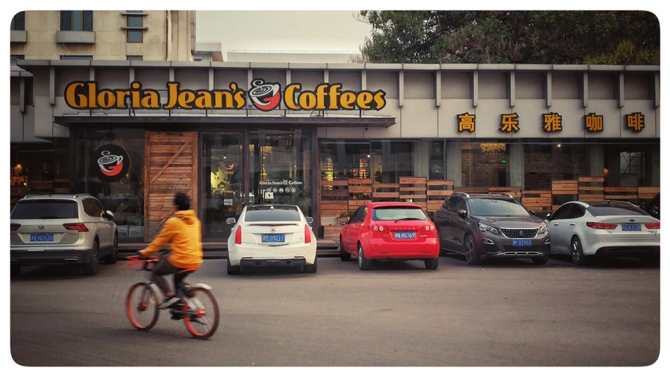 傍晚手机拍咖啡馆,快门速度降低,一个穿黄衣服骑摩拜的路人经过,配色很搭啊~