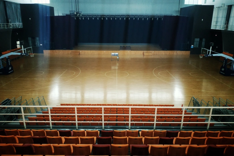 篮球赛后,空旷的体育馆以及红蓝双方的比分板