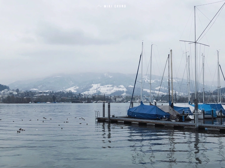 冬天的琉森,自带冷色调滤镜,远处隐约可见雪山。 拍完后没多久就下起了点点飘雪,好不浪漫。