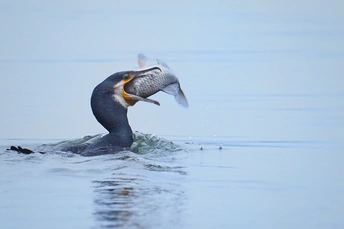 一只普通鸬鹚捕鱼得手后想把鱼吞下肚子,可惜鱼太大,得费好大力气才能把它吃下去