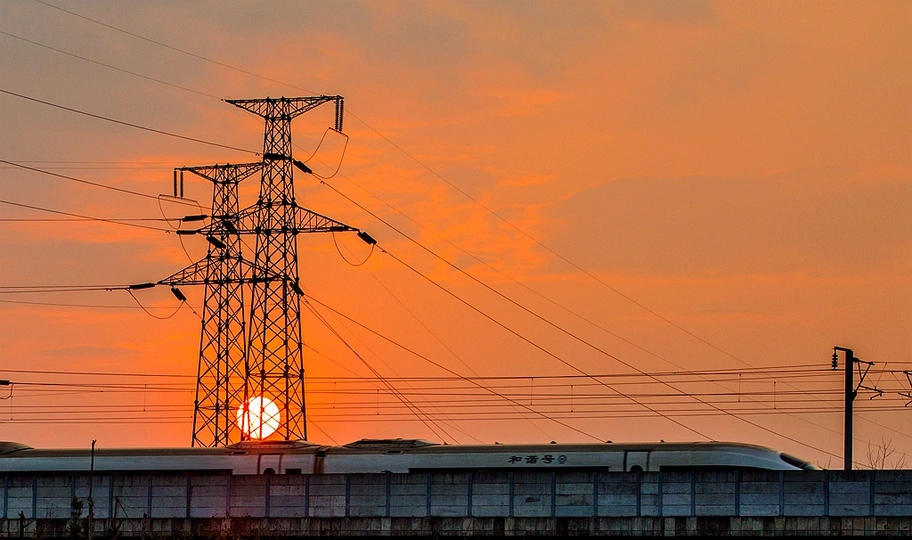 2019年1月28日,拍于成都市成华区北湖公园。夕阳西下,自然和人力能源簇拥着一辆和谐号高铁列车,高速驶过。