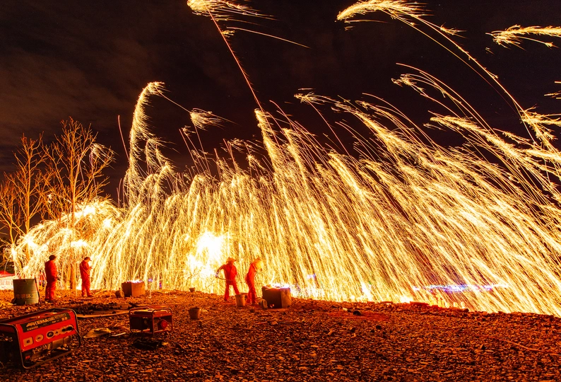 千树万树铁花开:民俗打铁花表演!拍摄于云南省嵩明县牛栏江镇百花箐!