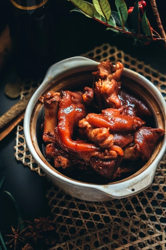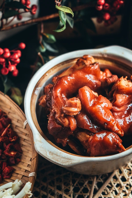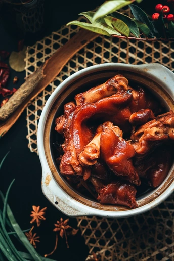 食记01 中式酱猪蹄 看着有木有很油腻,趁自己看着还行的时候发出来过两天可能看着就不是那么好看了, 注:咸甜口味 主料:猪脚5斤 辅料:生姜 香料:白芷 小茴香 香叶 八角 草果 桂皮 丁香(三个) 调料:海鲜酱 (三勺)排骨酱(两三勺) 叉烧酱(两勺) 南乳汁 (三勺) 鸡粉(一勺)老抽(一勺) 麦芽糖(一盒) 冰糖 鸡精(一勺) 生抽 2勺 古越龙山(一瓶) 做法 1.猪脚对半剁开小🔥烧毛,出水煮到没有白沫捞出冲水放入大锅中 2.另起一锅,锅中加入所有调料和香料煮开倒入猪爪中,大火煮开小火慢煮2 个小时,煮到脱骨捞出 未来的小店食谱:三木食记