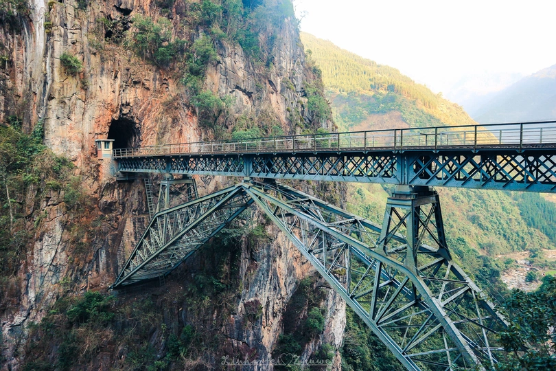 滇越铁路是连接越南海防市-中国河口-昆明的铁路,是中国西南地区的第一条铁路,被称之为与苏伊士运河、巴拿马运河相媲美的世界第三大工程,也是全国为数不多的"米轨"铁路。 五家寨铁路桥是滇越铁路线(中国昆明至越南河内)之间上一座大型肋式三铰拱钢梁桥,因其形恰似汉字“人”,故得名“人字桥”。又其造型别致如弓弩,又称为“弓弩手桥”,该桥位于云南省红河哈尼族彝族自治州屏边苗族自治县和平乡五家寨四岔河大峡谷上,波度箐站与倮姑站之间。该桥长67.15米,宽4.2米,桥面离谷底深泓线高102米,全用钢板、槽、角钢、铆钉联接而成。始建于1907年3月10日,因该铁路桥建设难度巨大,其法国铁路公司向外征集方案,最终由法国巴底纽勒工程建筑公司的工程师保罗·波登根据应用力学原理来设计,并由其公司承建,该因建设工程艰巨,期间牺牲近800名中国劳工。