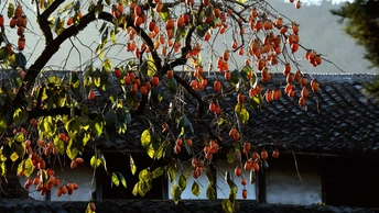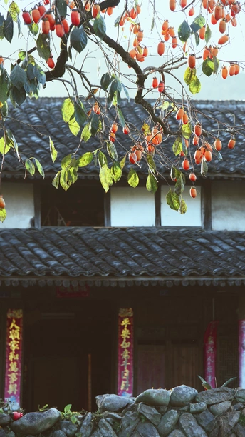 我其实不喜欢吃柿子,但却有特别喜欢柿子,因为柿子红了,年就近了。前一年去楠溪江玩的时候,看见满树的柿子特别心动,以前我们在文学书中读到过那些偷柿子的场景,让我蠢蠢欲动。于是我就下车趴在马路牙子上悄悄地偷了一颗柿子。今年深秋过后,又来楠溪江玩,抬头望见这一篇柿子树近在眼前,但却没有了那种“偷”的激动了。