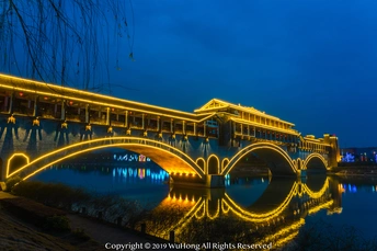 北川新城禹王桥—设计中融入了传统羌族的索桥、笮桥、碉楼形式,桥身外观采用了当地出产的传统青片石贴面,楼阁部分模仿地方特色的木构穿斗坡顶建筑,最外侧一排装饰木构架采用了大禹治水工具的形式。