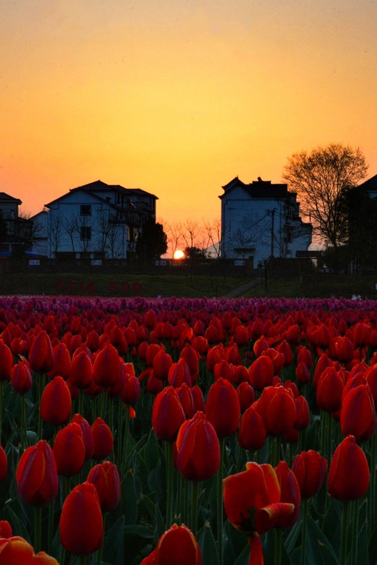 清晨初升的阳光给郁金香花海铺上了一层金色的霞光。