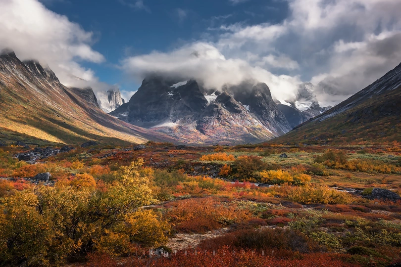 是秋天 云雾遮挡了山峰 但却没有遮挡住阳光 阳光下 各种颜色交织在一起 美丽而和谐 远山如黛 云雾飘渺 恍如秋天的童话世界