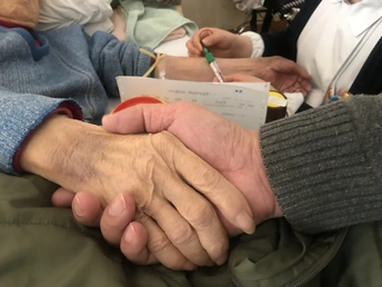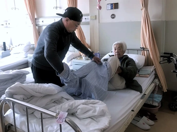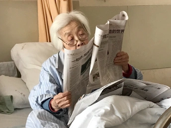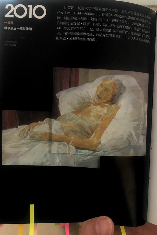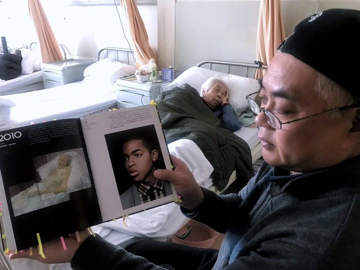 我在上海的一家医院里陪伴妈妈住院期间,隔壁床一位83岁老太太和一直精心呵护照顾着老人的儿子引起了我的关注,眼前常常能看到一幕幕感人的画面因碍于种种原因而错失拍摄。有一次看到老太太休息时孝顺儿子在病床边看一本画册,就主动搭讪才了解到他是一位画家,他说想给我看几张画册中历年来获一等奖的油画作品,当翻到2010年那一页时,画册中的作品(见图五)和我眼前呈现的整体画面立刻触动着我拿出手机抓拍到这一瞬间(见图一);有一次护士来抽血,老太太说怕疼不肯配合,儿子说我握着你的手别怕,当看到两双收握住的那一刻,我赶紧拿出手机问我可以给你们的手拍一张照片吗?(见图四);