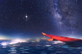 一个无月的夜晚,搭乘红眼航班,穿过云层,顶着璀璨的星空银河,仿佛翱翔于星际。