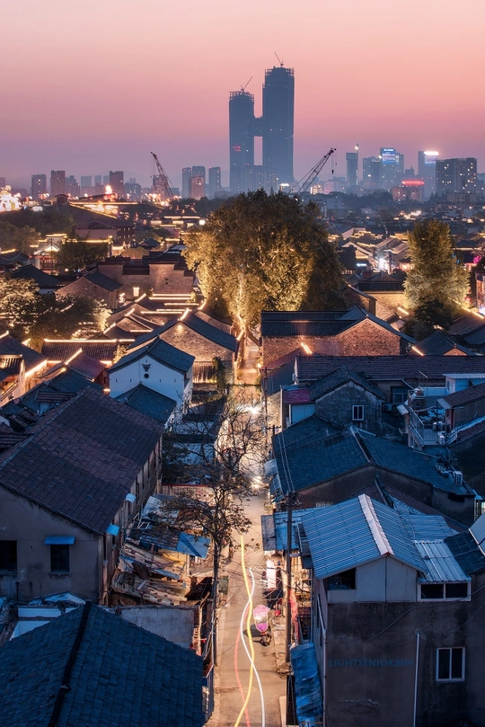 前景是南京未拆迁的门东老民居 中景是拆迁后新建的老门东景区 背景是代表河西高端消费的巨型建筑河西金鹰