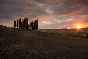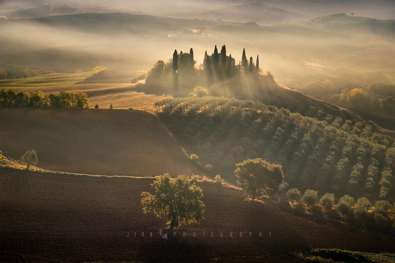 诗意田园 托斯卡纳 日落的阳光 即将隐去耀眼的光芒 最后时刻 阳光印红了天空 田园里几棵孤独的树 随风摆动 如诗如画