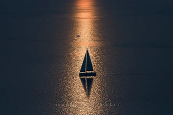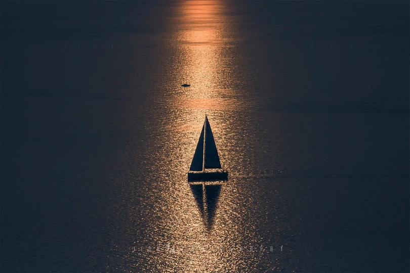 孤帆远影 日落时 阳光穿透朦胧的天际线 洒下一抹金色的阳光 照在亚得里亚海上 一艘归航的帆船 被阳光投下完美的影子